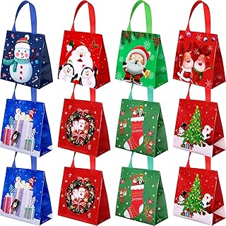12 Stück Weihnachten Nicht-Gewebt Taschen Tote Leckerlibeutel mit Griffen, Schöne Muster Design Einkaufstaschen für Gastgeschenke (Rot, Blau, Grün)