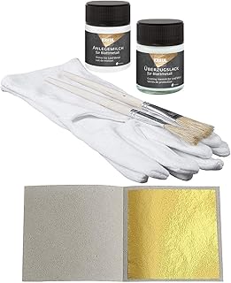 Set 50 Blatt Blattgold (Imit.) Schlagmetall zum Vergolden & Basteln 4,8 x 4,8 cm + 1 x Anlegemilch 50 ml + 1 x Überzugslack 50 ml + 1 Paar Vergolderhandschuhe + 2 Pinsel