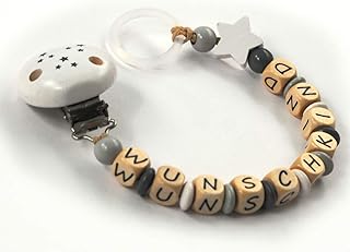 Schnullerkette"Wunschkind" für Mädchen und Jungen Stern - natur Ahorn weiß, grau inkl. Silikonadapter tolles Geschenk zur Taufe Geburt fürs Baby - Holz geprägte Holzbuchstaben, Unisex Kosename