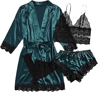 4 Teiliges Satin Pyjama Dessous-Sets, Dessous Frauen Spitze Babydoll Nachtwäsche Nachthemd Set Kimono Damen Morgenmantel Satin Bademantel Seide Roben V Ausschnitt Mit Blumenspitze